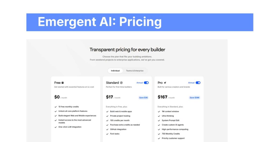 Emergent AI employs a credit-based system instead of a fixed subscription. Users are given a small amount of credits with their free account, and are able to use for basic tests or small-scale builds.
