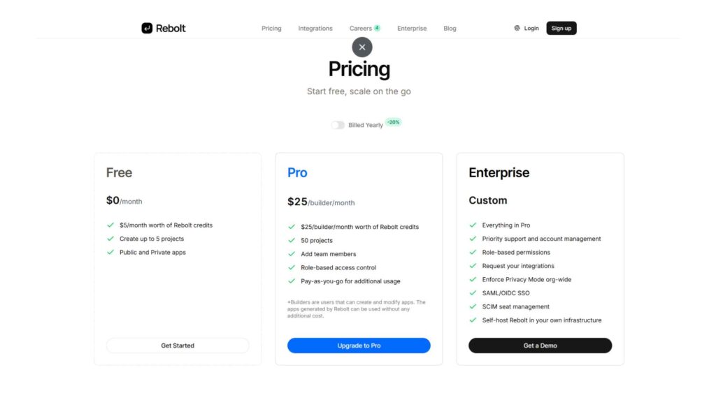 Rebolt offers a variety of plans, including a free trial plan and a Pro/Builder plan and customized Enterprise plans. The pricing page include the credit model for builders and an example of the prices.