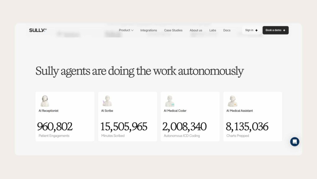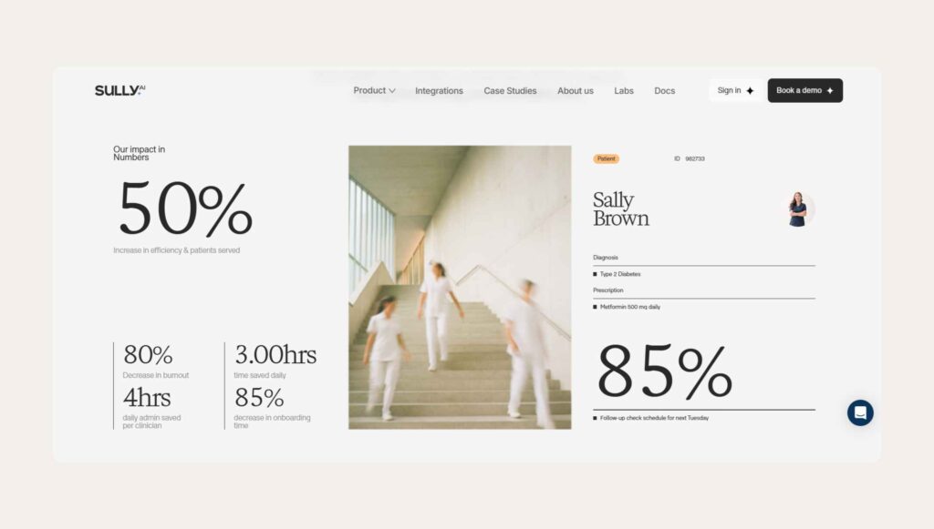Huge time-save: documentation and even intake automation can save many hours of work. One of the case studies mentions “2.8 hours saved daily thanks to Sully AI”.