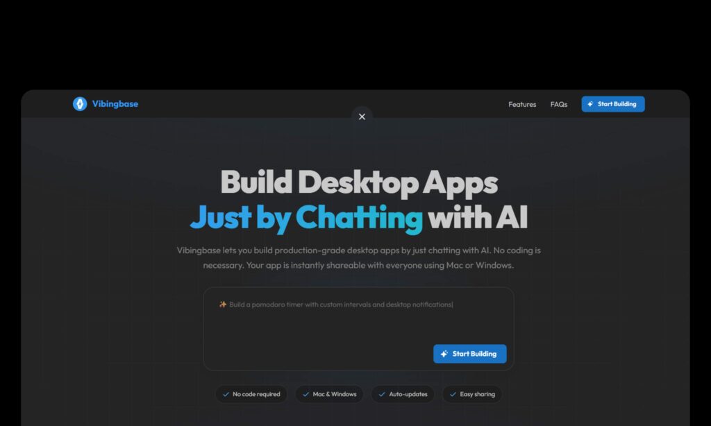 Vibingbase is the first AI tool I’ve used that can take a casual sentence and turn it into a proper native desktop app for macOS or Windows.